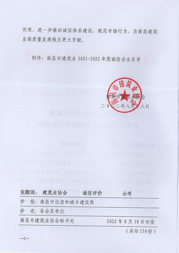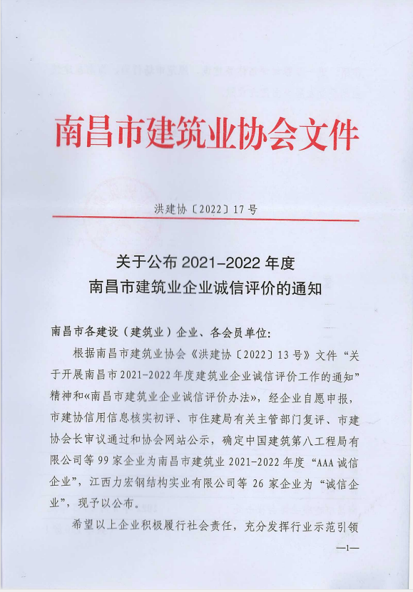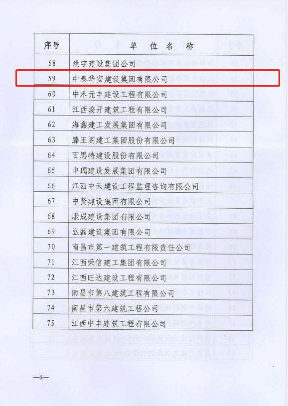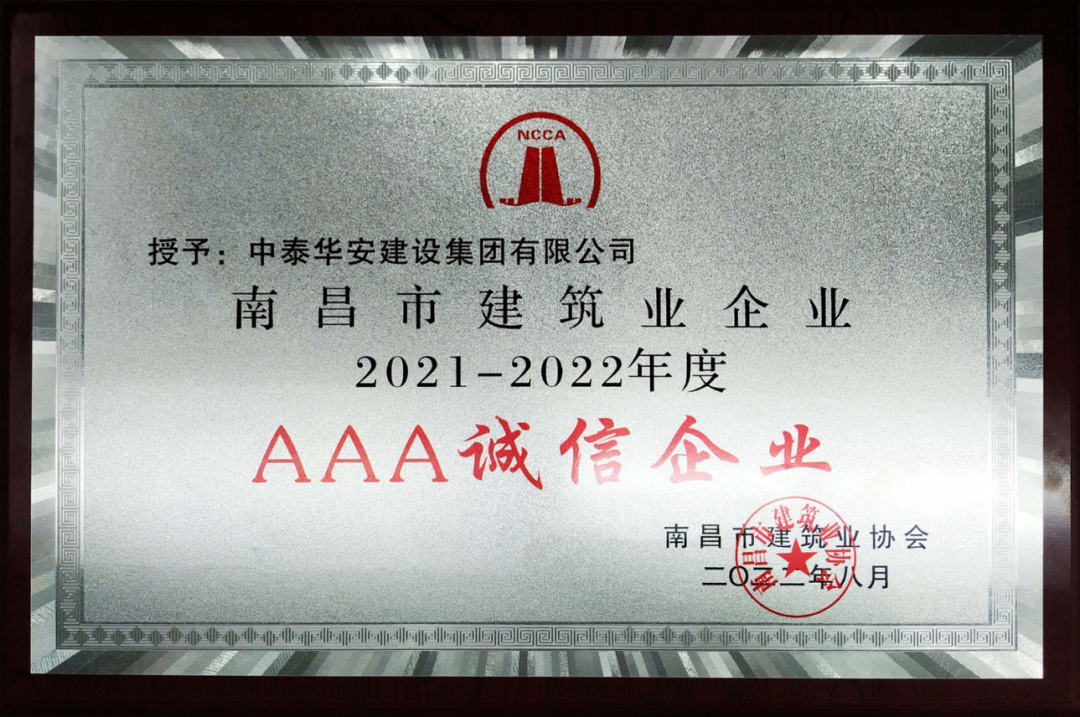 近日,南昌市建筑业协会发布的2021-2022年度南昌市建筑业企业诚信评价结果正式揭晓。中泰华安建设集团有限公司再次列居榜单,荣获南昌市建筑业2021-2022年度“AAA诚信企业”称号。