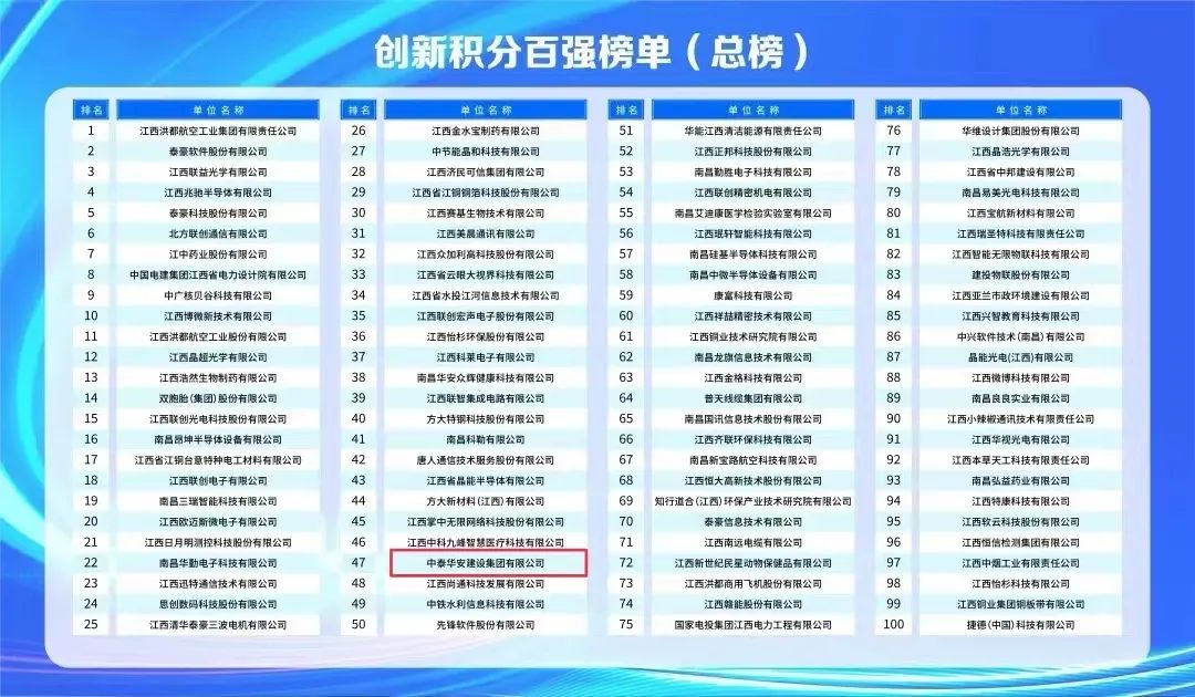 9月28日,江西省首批创新积分百强企业榜单正式公布,南昌高新区通过创新积分制对全区1000多家入库的科技型企业进行积分评价,评选出创新积分排名前100强企业,中泰华安建设集团有限公司成功入选,位列榜单第47位。