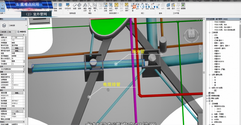 室外管网涉及消防、给水、排水、污水、强电等多个专业,通过对本项目室外管网建模,共发现各专业碰撞问题16项,提前避免各专业管线冲突,减少返工。同时进行方案优化,利用BIM模型验证方案可行性并确定最终方案,以此方便提前施工,缩短工期。