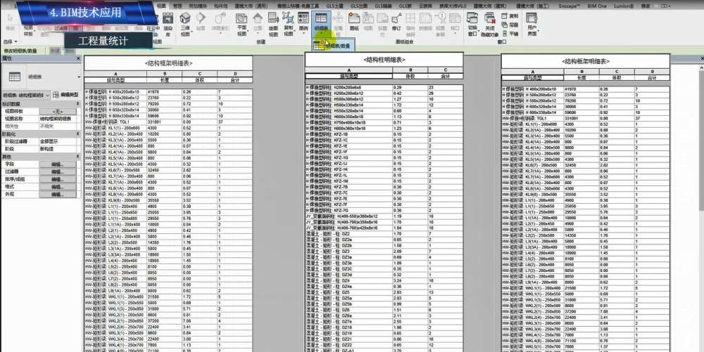 通过精细化BIM建模,利用明细表实时统计功能,可根据项目要求对不同种类、不同区域的混凝土用量进行分类统计,实时把控现场混凝土浇筑用量,做到精细化成本控制。